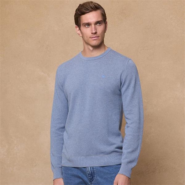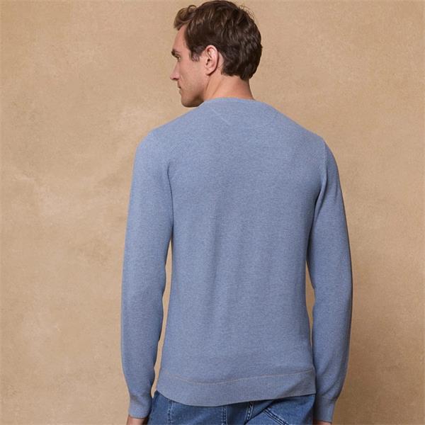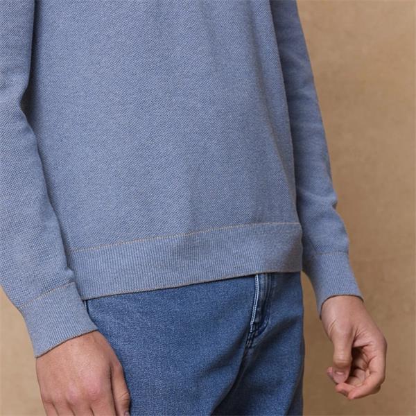 Shop the Charlie Micro Crew Neck Jumper in blue. A lightweight men’s cotton knitwear essential, perfect for layering and everyday smart-casual style.