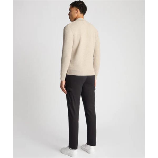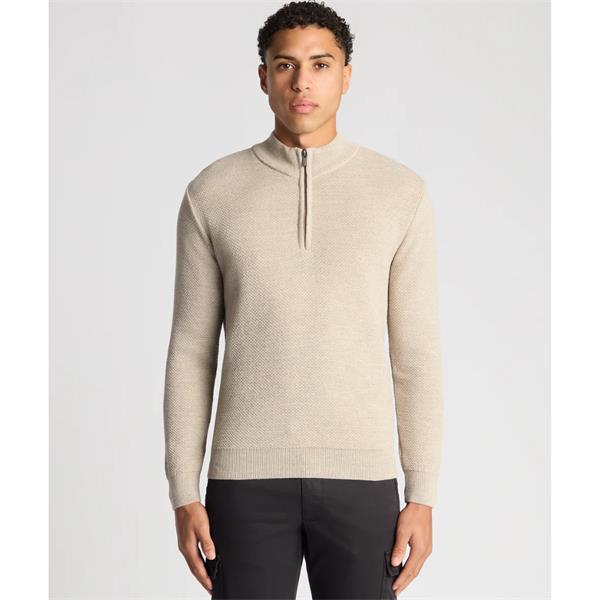 Oatmeal tapered fit Merino half zip sweater with all over micro tuck knit structure. Ribbed collar, cuff and hem.
