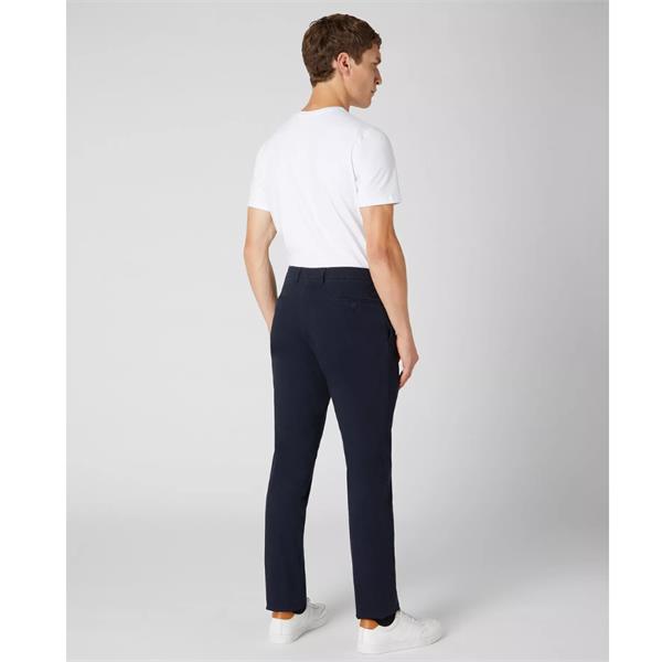Navy slim leg cotton-stretch garment washed chino with zip fly and feature button.