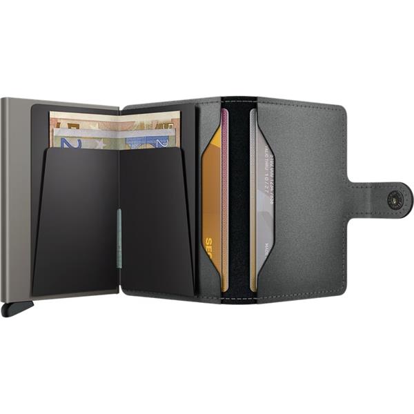 Small in size and surprisingly large in storage capacity, the Miniwallet combines the best of both worlds. The exterior holds banknotes, receipt and cards, while the aluminium Cardprotector allows you to slide out cards with one simple motion and protects them from bending, breaking and unwanted wireless communication.
