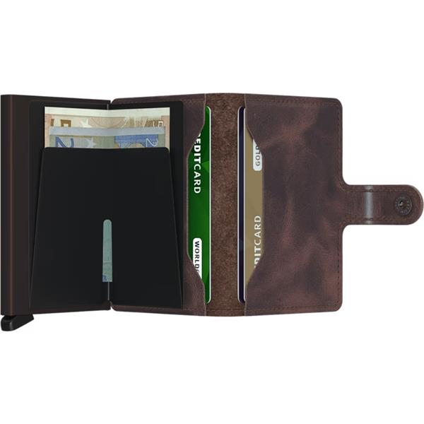 Small in size and surprisingly large in storage capacity, the Miniwallet combines the best of both worlds. The exterior holds banknotes, receipt and cards, while the aluminium Cardprotector allows you to slide out cards with one simple motion and protects them from bending, breaking and unwanted wireless communication.